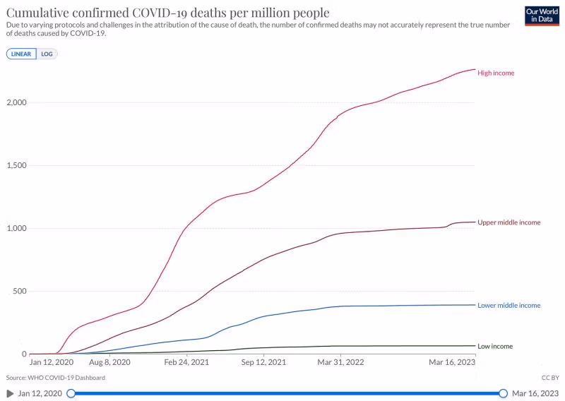 დიახ, მაღალი შემოსავლის მქონე, მაღალვაქცინირებული ქვეყნები, როგორც წესი, უფრო ხანდაზმულები არიან, ხოლო დაბალი შემოსავლის მქონე ქვეყნებს შორის სიკვდილიანობის სხვაობა გაცილებით დიდია, ვიდრე ასაკობრივმა სხვაობამ შეიძლება გამოიწვიოს, განსაკუთრებით ვაქცინაციის სტატუსის გათვალისწინებით.