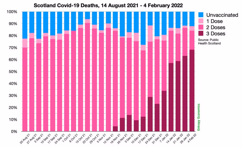 ან შეხედეთ შოტლანდიას, რომელიც ვაქცინაციის სტატუსის მიხედვით შედარებით უკეთეს და უფრო დეტალურ მონაცემებს ინახავს. 2021 წლის აგვისტოდან 2022 წლის თებერვლამდე, სულ მცირე 85 პროცენტს კოვიდ-90-ით გარდაცვლილთა შორის ვაქცინირებული იყო. გაზაფხულის ბოლოსთვის ეს მაჩვენებელი XNUMX პროცენტს გადააჭარბა. მას შემდეგ, რაც ეს აღვნიშნეთ, მათ შეწყვიტეს ასეთი მონაცემების გამოქვეყნება.