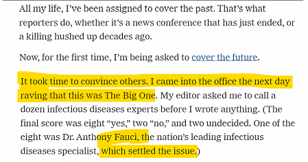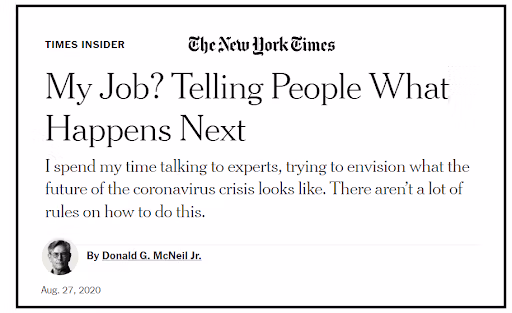 თითქმის 50 წლის განმავლობაში, ტიპური New York Times რეპორტიორმა დონალდ ჯ. მაკნილ უმცროსმა „ყველაფერი გააკეთა“: კოპირატორობიდან უცხოელ კორესპონდენტამდე, შემდეგ კი სამეცნიერო რეპორტიორამდე; საბოლოოდ, გლობალური ჯანდაცვის მთავარ ფიგურად: მისი კარიერული წარმატებები სიმბიოზურად იყო გადაჯაჭვული მის ყველაზე ხშირად ციტირებულ სფეროს ექსპერტებთან, NIAID-ისა და CDC-ის ყოფილ ხელმძღვანელებთან, დოქტორ ენტონი ფაუჩისთან და ტომ ფრიდენთან; წვდომა სამუშაოზე გაცვალა. შემდეგ დადგა კოვიდი.